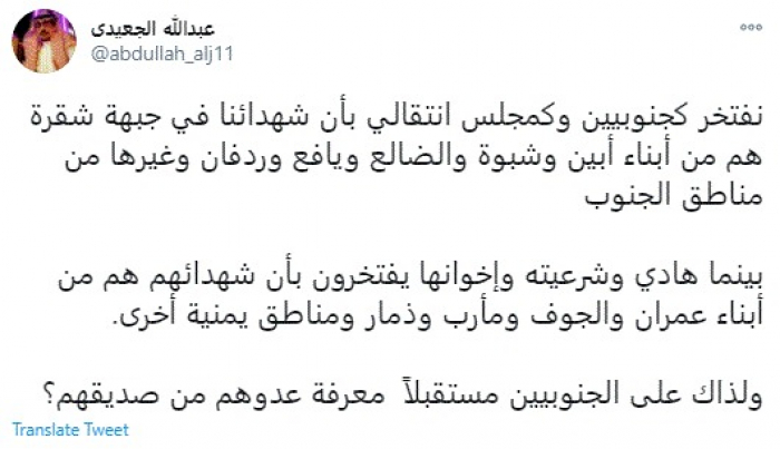 وكتب في تغريدة عبر "تويتر" رصدها "المشهد العربي": "نفتخر كجنوبيين وكمجلس انتقالي بأن شهدائنا في جبهة شقرة هم من أبناء أبين وشبوة والضالع ويافع وردفان وغيرها من مناطق الجنوب".