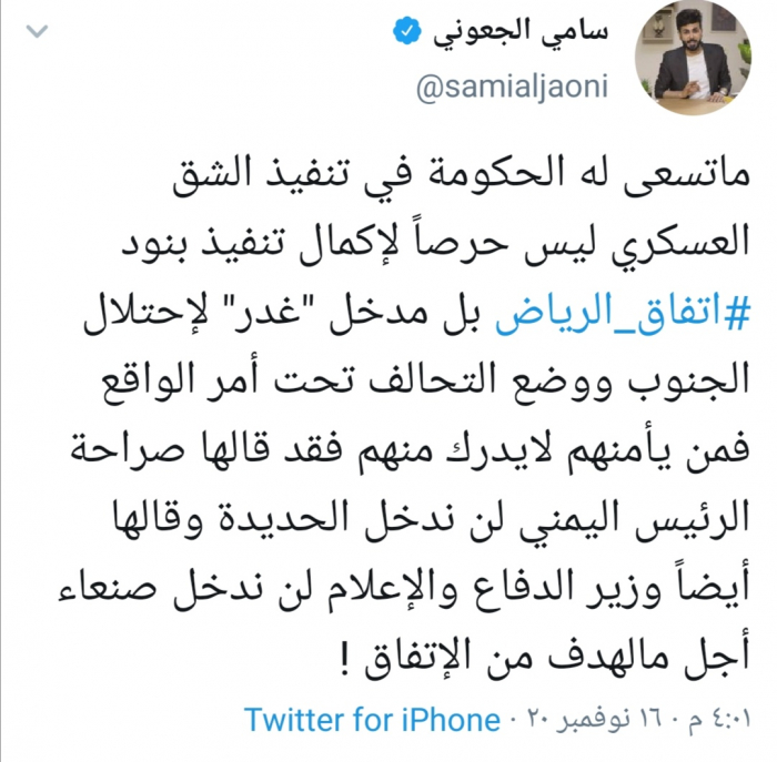 وقال الجعوني في تغريدة له عبر حسابه بتويتر ورصدها "المشهد العربي" : "ماتسعى له الحكومة في تنفيذ الشق العسكري ليس حرصا لإكمال تنفيذ بنود اتفاق الرياض بل مدخل "غدر" لاحتلال الجنوب ووضع التحالف تحت أمر الواقع".