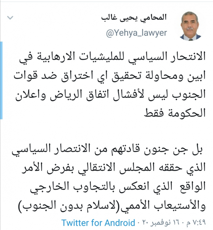 هاجم الناشط السياسي المحامي يحيى غالب، مليشيات الشرعية الإخوانية في أبين، مؤكدا أنه جن جنونها بعد الانتصار السياسي الذي حققه المجلس الانتقالي في أبين.