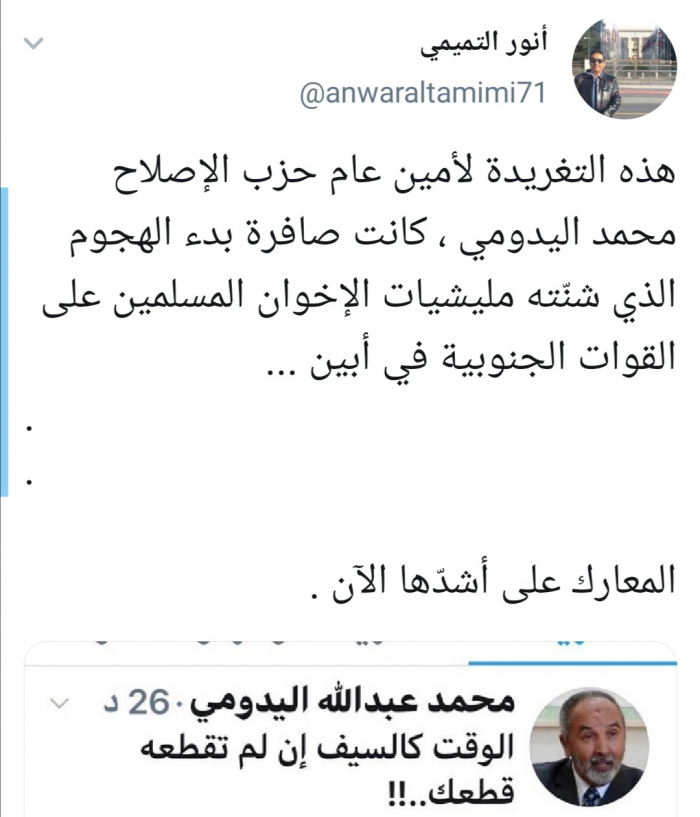 وقال التميمي في تغريدة له عبر حسابه بتويتر ورصدها "المشهد العربي": "هذه التغريدة لأمين عام حزب الإصلاح محمد اليدومي ، كانت صافرة بدء الهجوم الذي شنّته مليشيات الإخوان المسلمين على القوات الجنوبية في أبين".