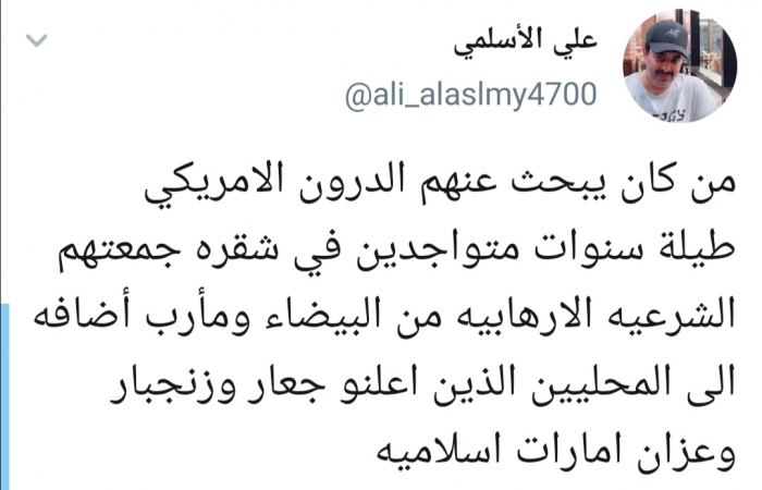وقال الأسلمي في تغريدة له عبر حسابه بتويتر ورصدها "المشهد العربي": "من كان يبحث عنهم الدرون الأمريكي طيلة سنوات متواجدون في شقرة جمعتهم الشرعية الإرهابية من البيضاء ومأرب إضافة إلى المحليين الذين أعلنوا جعار وزنجبار وعزان إمارات إسلامية".