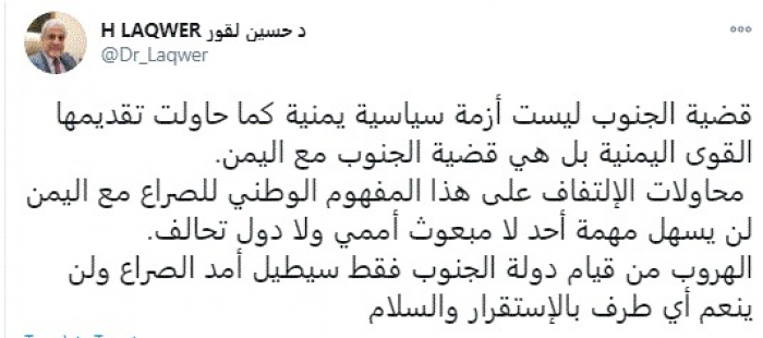 وكتب في تغريدة عبر "تويتر" رصدها "المشهد العربي": "قضية الجنوب ليست أزمة سياسية يمنية كما حاولت تقديمها القوى اليمنية بل هي قضية الجنوب مع اليمن".