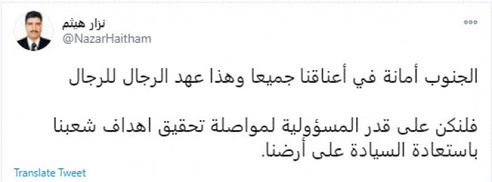وكتب في تغريدة عبر "تويتر" رصدها "المشهد العربي": "الجنوب أمانة في أعناقنا جميعًا وهذا عهد الرجال للرجال فلنكن على قدر المسؤولية لمواصلة تحقيق اهداف شعبنا باستعادة السيادة على أرضنا".