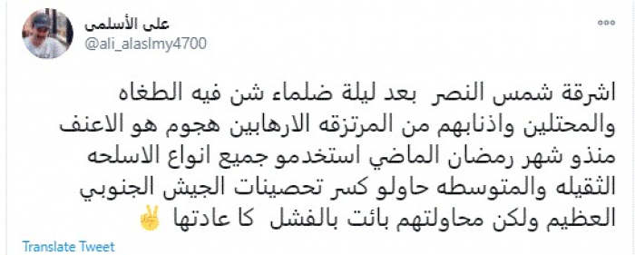 وكتب في تغريدة عبر "تويتر" رصدها "المشهد العربي": "أشرقت شمس النصر بعد ليلة ظلماء شن فيه الطغاة والمحتلين وأذنابهم من المرتزقة الإرهابين هجوم هو الأعنف منذ شهر رمضان الماضي".