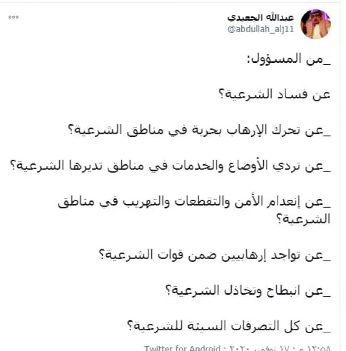 وأضاف: "عن إنعدام الأمن والتقطعات والتهريب في مناطق الشرعية؟ عن تواجد إرهابيين ضمن قوات الشرعية؟ عن انبطاح وتخاذل الشرعية؟ عن كل التصرفات السيئة للشرعية؟".