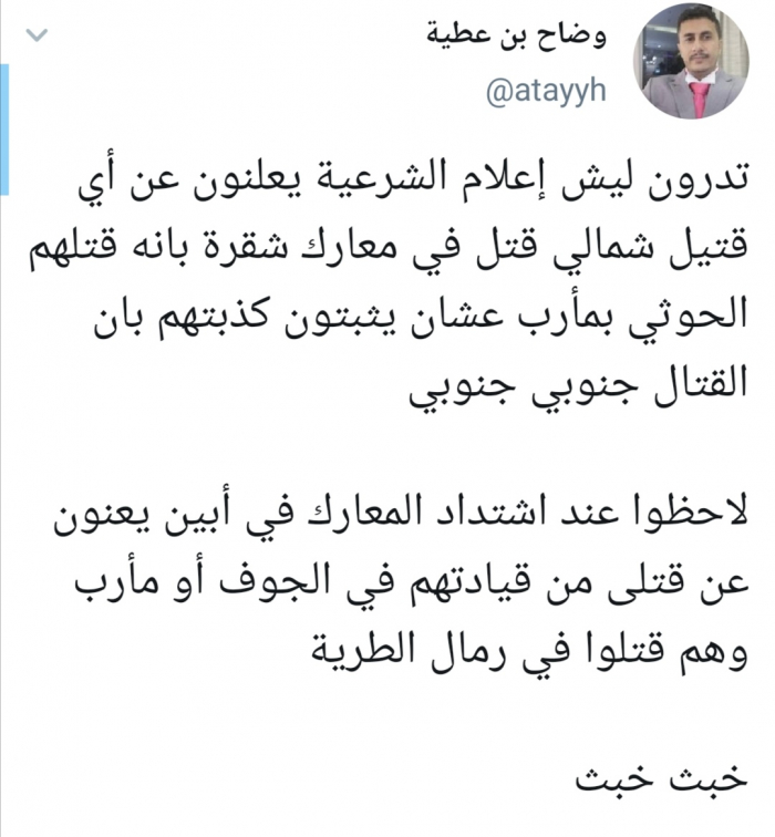 وأضاف بن عطية: "لاحظوا عند اشتداد المعارك في أبين يعلنون عن قتلى من قياداتهم في الجوف أو مأرب وهم قتلوا في رمال الطرية". مختتما تغريدته بقوله" خبث خبث".