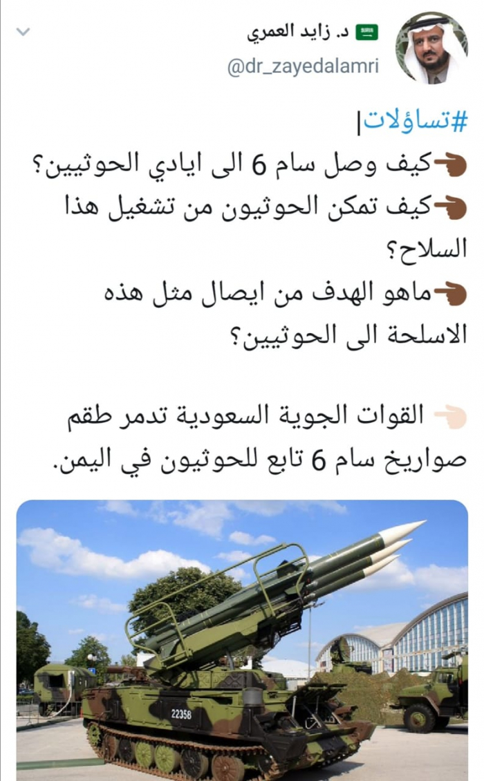 وقال العمري في تغريدة له عبر حسابه بتويتر ورصدها المشهد العربي: "تساؤلات كيف وصل سام 6 إلى أيادي الحوثيين؟، كيف تمكن الحوثيون من تشغيل هذا السلاح؟، ماهو الهدف من إيصال مثل هذه الأسلحة إلى الحوثيين؟