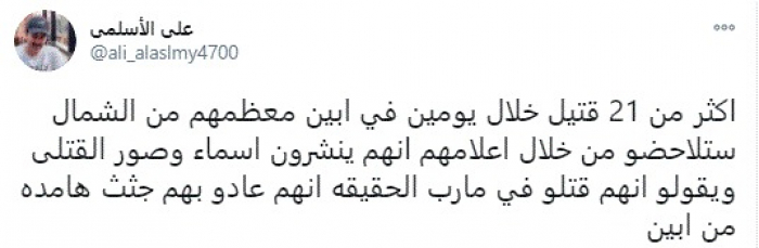وقال في تغريدة عبر "تويتر" رصدها "المشهد العربي": "أكثر من 21 قتيل خلال يومين في أبين معظمهم من الشمال ستلاحظوا من خلال إعلامهم أنهم ينشرون أسماء وصور القتلى ويقولوا أنهم قتلوا في مأرب، الحقيقة إنهم عادوا بهم جثث هامدة من أبين".