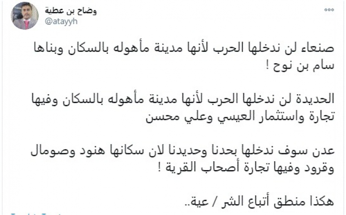 وقال في تغريدة عبر "تويتر" رصدها "المشهد العربي": "صنعاء لن ندخلها الحرب لأنها مدينة ماهولة بالسكان وبناها سام بن نوح".