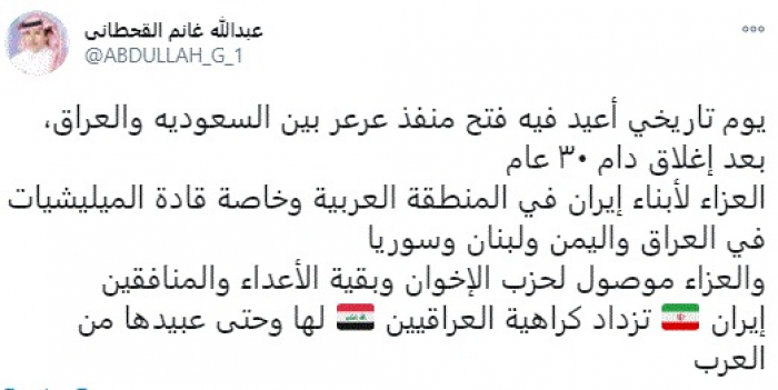 القحطاني عن معبر عرعر: العزاء لأبناء إيران في العراق واليمن ولبنان