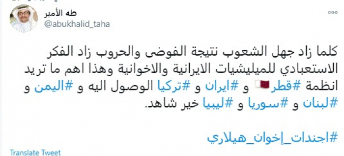 وكتب في تغريدة عبر "تويتر" رصدها "المشهد العربي": "كلما زاد جهل الشعوب نتيجة الفوضى والحروب زاد الفكر الاستعبادي للمليشيات الإيرانية والإخوانية وهذا أهم ما تريد أنظمة قطر وإيران وتركيا الوصول إليه واليمن ولبنان وسوريا وليبيا خير شاهد".