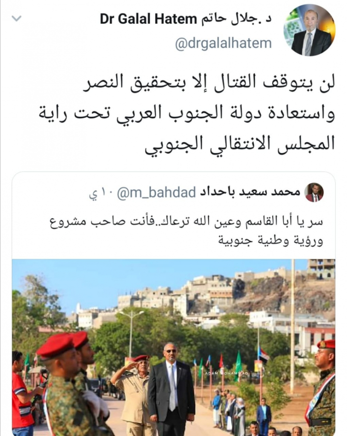 وقال حاتم في تغريدة له عبر حسابه بتويتر ورصدها "المشهد العربي": "لن يتوقف القتال إلا بتحقيق النصر واستعادة دولة الجنوب العربي تحت راية المجلس الانتقالي الجنوبي".