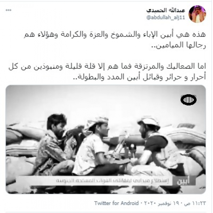 وأضاف: "أما الصعاليك والمرتزقة فما هم إلا قلة قليلة ومنبوذين من كل أحرار و حرائر وقبائل أبين المدد والبطولة".