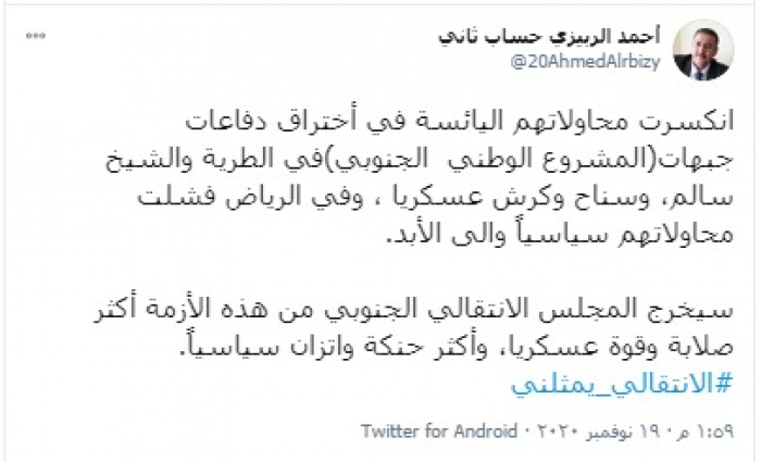وكتب "الربيزي" تغريدة عبر تويتر، رصدها "المشهد العربي": "انكسرت محاولاتهم اليائسة في اختراق دفاعات جبهات (المشروع الوطني الجنوبي) في الطرية والشيخ سالم، وسناح وكرش عسكريًا، وفي الرياض فشلت محاولاتهم سياسيًا وإلى الأبد".