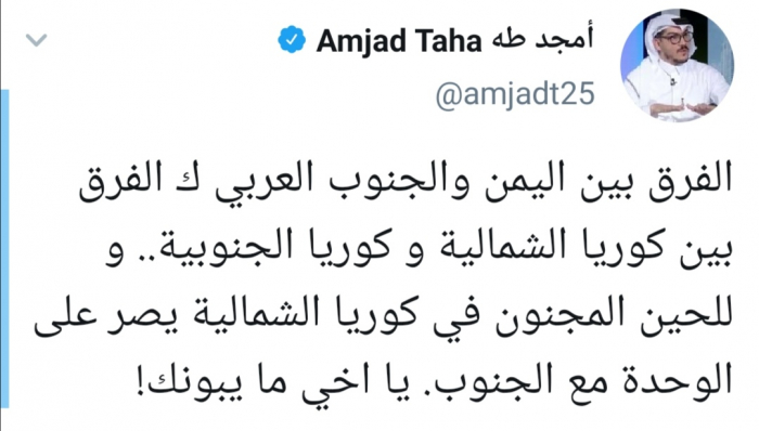 وقال طه في تغريدة له عبر حسابه بتويتر ورصدها "المشهد العربي": "الفرق بين اليمن والجنوب العربي كالفرق بين كوريا الشمالية و كوريا الجنوبية.. وللحين المجنون في كوريا الشمالية يصر على الوحدة مع الجنوب. يا أخي ما يبونك".