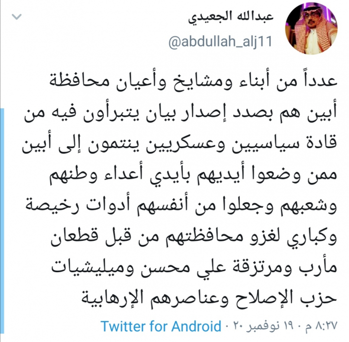 وقال الجعيدي عبر حسابه في تويتر ورصدها "المشهد العربي": "عدد من أبناء ومشايخ وأعيان محافظة أبين هم بصدد إصدار بيان يتبرأون فيه من قادة سياسيين وعسكريين ينتمون إلى أبين ممن وضعوا أيديهم بأيدي أعداء وطنهم وشعبهم".
