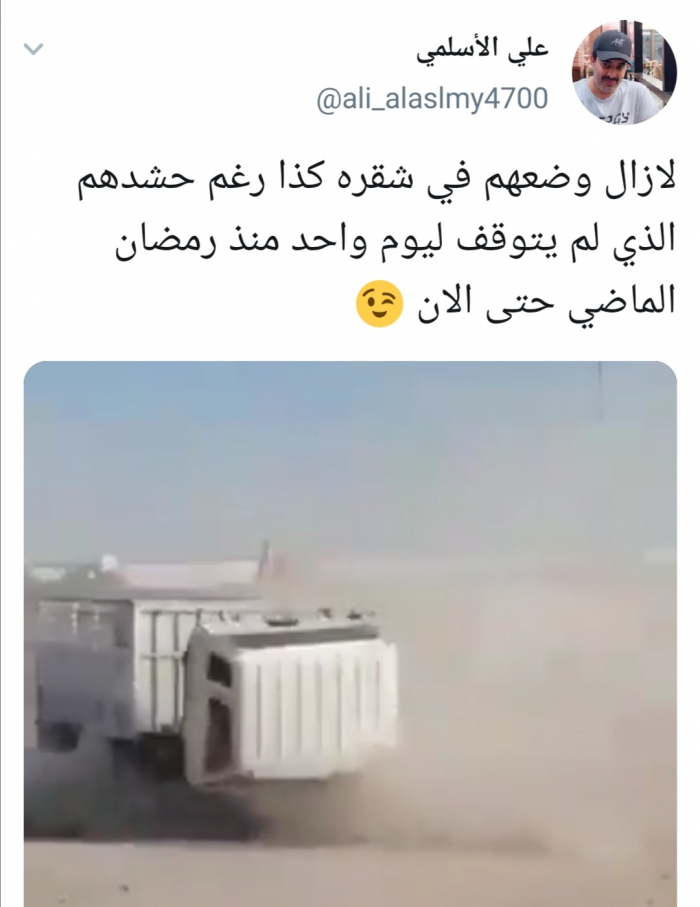 وقال الأسلمي في تغريدة له عبر حسابه بتويتر ورصدها "المشهد العربي": "لازال وضعهم في شقرة كذا رغم حشدهم الذي لم يتوقف ليوم واحد منذ رمضان الماضي حتى الآن".