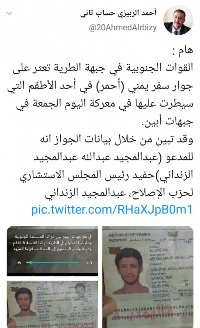 وأضاف: "تبين من خلال بيانات الجواز أنه للمدعو (عبدالمجيد عبدالله عبدالمجيد الزنداني) حفيد رئيس المجلس الاستشاري لحزب الإصلاح، عبدالمجيد الزنداني".