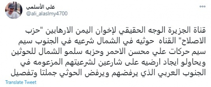 وقال في تغريدة عبر "تويتر" رصدها "المشهد العربي": "قناة الجزيرة الوجه الحقيقي لإخوان اليمن الإرهابيين حزب الإصلاح".