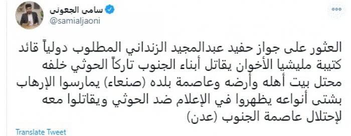 وقال في تغريدة عبر "تويتر" رصدها "المشهد العربي": "العثور على جواز حفيد عبدالمجيد الزنداني المطلوب دوليًا قائد كتيبة مليشيا الإخوان يقاتل أبناء الجنوب تاركًا الحوثي خلفه محتل بيت أهله وأرضه وعاصمة بلده (صنعاء) يمارسوا الإرهاب بشتى أنواعه يظهروا في الإعلام ضد الحوثي ويقاتلوا معه لاحتلال عاصمة الجنوب (عدن)".