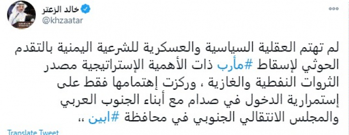 وقال في تغريدة عبر "تويتر" رصدها "المشهد العربي": "لم تهتم العقلية السياسية والعسكرية للشرعية اليمنية بالتقدم الحوثي لإسقاط مأرب ذات الأهمية الإستراتيجية مصدر الثروات النفطية والغازية، وركزت اهتمامها فقط على استمرارية الدخول في صدام مع أبناء الجنوب العربي والمجلس الانتقالي الجنوبي في محافظة أبين".