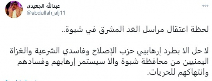 وأضاف: "لا حل إلا بطرد إرهابيي حزب الإصلاح وفاسدي الشرعية والغزاة اليمنيين من محافظة شبوة وإلا سيستمر إرهابهم وفسادهم وانتهاكهم للحريات".