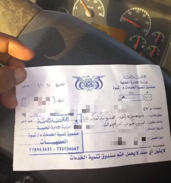 وتداول رواد مواقع التواصل الاجتماعي سندات تحصيل بمبالغ ضخمة فرضتها مليشيا الشرعية الإخوانية على سائقي النقل في مداخل محافظة شبوة.
