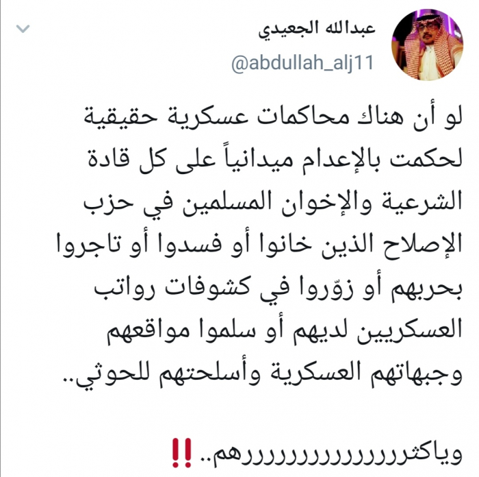 وقال الجعيدي عبر حسابه في تويتر ورصدها "المشهد العربي": "لو أن هناك محاكمات عسكرية حقيقية لحكمت بالإعدام ميدانيا على كل قادة الشرعية والإخوان المسلمين في حزب الإصلاح الذين خانوا أو فسدوا أو تاجروا بحربهم أو زوّروا في كشوفات رواتب العسكريين لديهم أو سلموا مواقعهم وجبهاتهم العسكرية وأسلحتهم للحوثي".