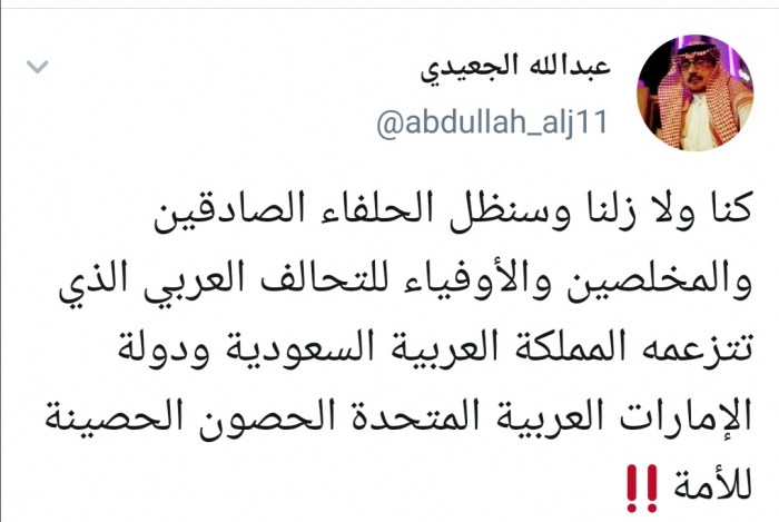 وقال الجعيدي عبر حسابه في تويتر ورصدها "المشهد العربي": "كنا ولا زلنا وسنظل الحلفاء الصادقين والمخلصين والأوفياء للتحالف العربي الذي تتزعمه المملكة العربية السعودية ودولة الإمارات العربية المتحدة الحصون الحصينة للأمة".