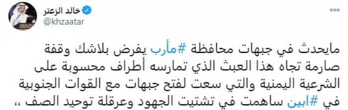وكتب في تغريدة عبر "تويتر" رصدها "المشهد العربي": "ما يحدث في جبهات محافظة مأرب يفرض بلا شك وقفة صارمة تجاه هذا العبث الذي تمارسه أطراف محسوبة على الشرعية اليمنية والتي سعت لفتح جبهات مع القوات الجنوبية في أبين ساهمت في تشتيت الجهود وعرقلة توحيد الصف".