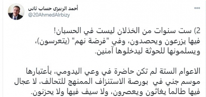 وقال في تغريدة عبر "تويتر" رصدها "المشهد العربي": "ست سنوات من الخذلان ليست في الحسبان! فيها يزرعون ويحصدون، وفي فرضة نهم (.....)، ويسلمونها للحوثة ليدخلوها آمنين".