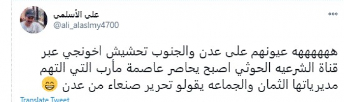 وقال في تغريدة عبر "تويتر" رصدها "المشهد العربي": "عيونهم على عدن والجنوب، تحشيش إخونجي عبر قناة الشرعية الحوثي أصبح يحاصر عاصمة مأرب التي التهم مديرياتها الثمان والجماعة يقولوا تحرير صنعاء من عدن".