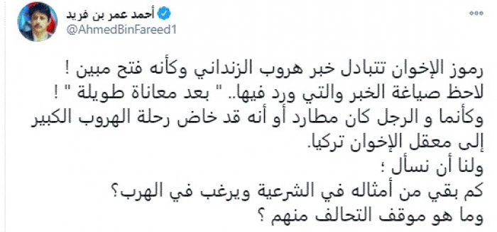 بن فريد يُعلق على احتفال قيادات الإخوان بهروب الزنداني لتركيا