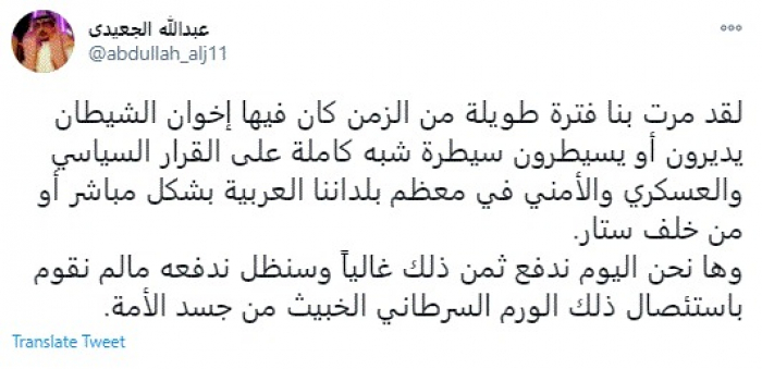 وقال في تغريدة عبر "تويتر" رصدها "المشهد العربي": "لقد مرت بنا فترة طويلة من الزمن كان فيها إخوان الشيطان يديرون أو يسيطرون سيطرة شبه كاملة على القرار السياسي والعسكري والأمني في معظم بلداننا العربية بشكل مباشر أو من خلف ستار".