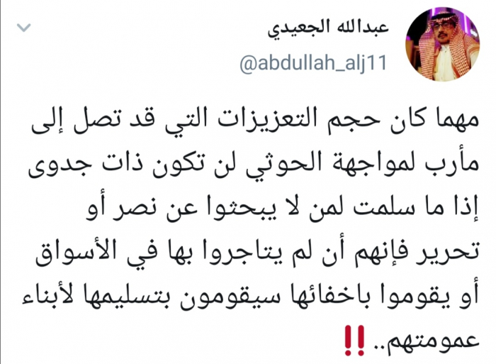 وقال الجعيدي عبر حسابه في تويتر ورصدها "المشهد العربي": "مهما كان حجم التعزيزات التي قد تصل إلى مأرب لمواجهة الحوثي لن تكون ذات جدوى إذا ما سلمت لمن لا يبحثون عن نصر أو تحرير".
