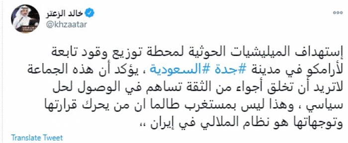 وقال في تغريدة عبر "تويتر" رصدها "المشهد العربي": "استهداف المليشيات الحوثية لمحطة توزيع وقود تابعة لأرامكو في مدينة جدة السعودية، يؤكد أن هذه الجماعة لا تريد أن تخلق أجواء من الثقة تساهم في الوصول لحل سياسي، وهذا ليس بمستغرب طالما أن من يحرك قرارتها وتوجهاتها هو نظام الملالي في إيران".