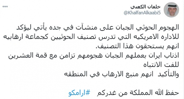 وقال في تغريدة عبر "تويتر" رصدها "المشهد العربي": "الهجوم الحوثي الجبان على منشآت في جدة يأتي ليؤكد للإدارة الأمريكية التي تدرس تصنيف الحوثيين كجماعة إرهابية إنهم يستحقون هذا التصنيف".