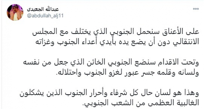 وقال في تغريدة عبر "تويتر" رصدها "المشهد العربي": "على الأعناق سنحمل الجنوبي الذي يختلف مع المجلس الانتقالي دون أن يضع يده بأيدي أعداء الجنوب وغزاته".