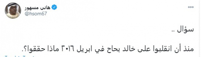 وقال في تغريدة عبر "تويتر" رصدها "المشهد العربي": "سؤال.. منذ أن انقلبوا على خالد بحاح في ابريل 2016 ماذا حققوا؟".