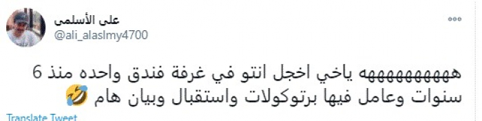وقال في تغريدة عبر "تويتر" رصدها "المشهد العربي": "ههه يا أخي اخجل أنتوا في غرفة فندق واحدة منذ 6 سنوات وعامل فيها برتوكولات واستقبال وبيان هام".