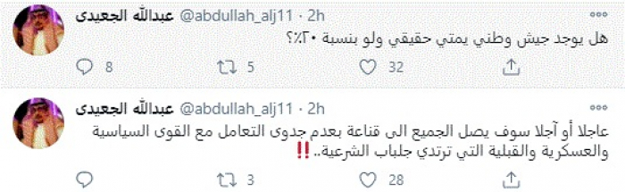 وأضاف في تغريدة أخرى: "هل يوجد جيش وطني يمني حقيقي ولو بنسبة 20٪؟".