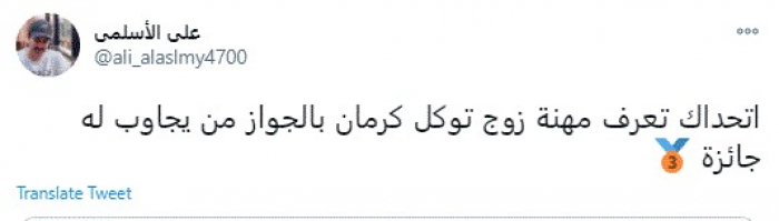 وقال في تغريدة عبر "تويتر" رصدها "المشهد العربي": "أتحداك تعرف مهنة زوج توكل كرمان بالجواز من يجاوب له جائزة".