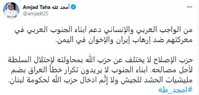 أمجد طه يُطالب بدعم الجنوبيين في معركتهم ضد إرهاب إيران وإخوان اليمن