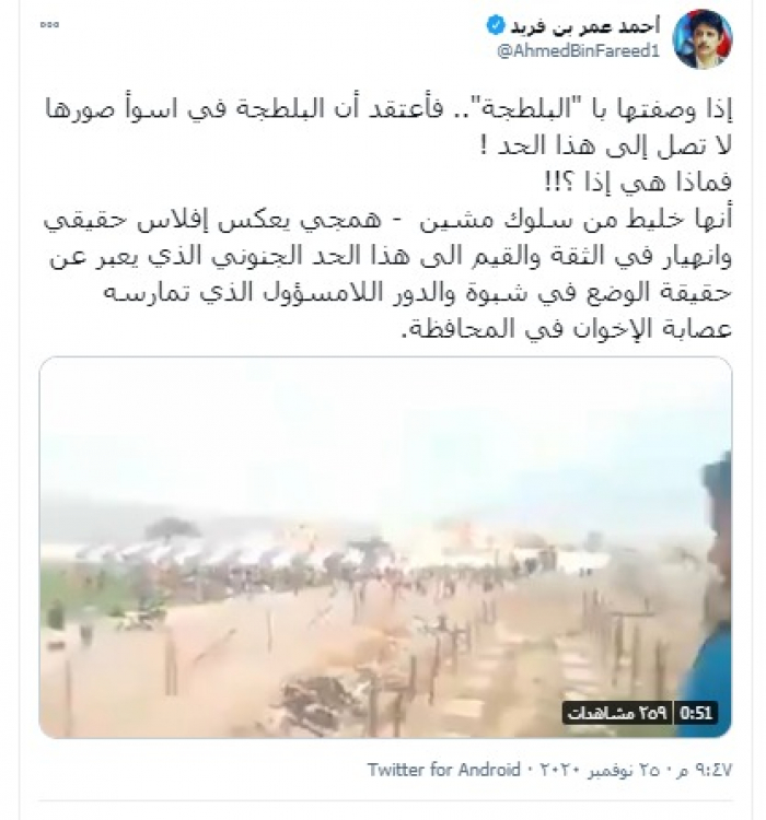 ونشر "بن فريد" فيديو عبر حسابه الشخصي بتويتر، معلقًا عليه بالقول: "إذا وصفتها بـ "البلطجة".. فأعتقد أن البلطجة في أسوأ صورها لا تصل إلى هذا الحد، فماذا هي إذًا؟".