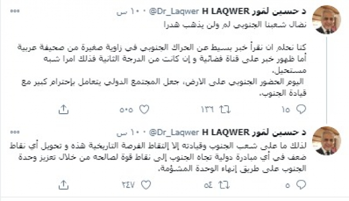 وكتب "لقور" تغريدة عبر تويتر، رصدها "المشهد العربي": "نضال شعبنا الجنوبي لم ولن يذهب هدرًا".
