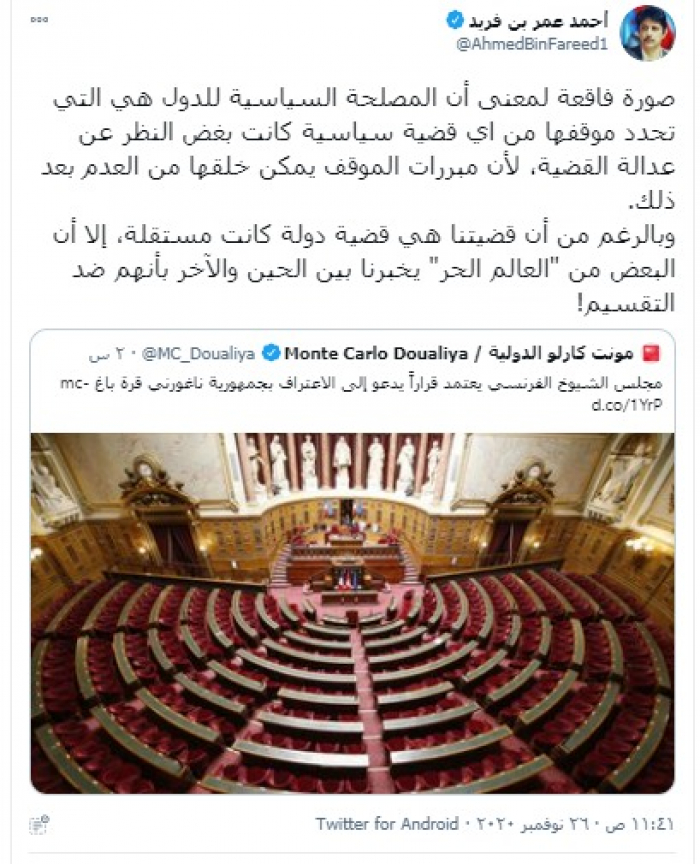 وكتب "بن فريد" تغريدة عبر تويتر، رصدها "المشهد العربي": "صورة فاقعة لمعنى أن المصلحة السياسية للدول هي التي تحدد موقفها من أي قضية سياسية كانت بغض النظر عن عدالة القضية، لأن مبررات الموقف يمكن خلقها من العدم بعد ذلك".