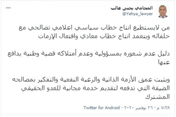 وكتب "غالب" تغريدة عبر تويتر، رصدها "المشهد العربي": "من لايستطيع إنتاج خطاب سياسي إعلامي تصالحي مع حلفائه ويتعمد إنتاج خطاب معادي وافتعال الأزمات".