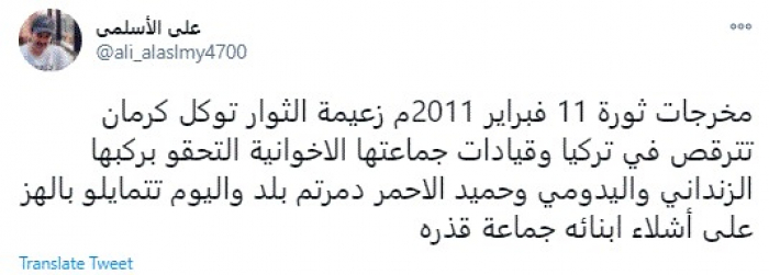 وقال في تغريدة عبر "تويتر" رصدها "المشهد العربي": "مخرجات ثورة 11 فبراير 2011م زعيمة الثوار توكل كرمان تترقص في تركيا وقيادات جماعتها الإخوانية التحقوا بركبها الزنداني واليدومي وحميد الأحمر دمرتم بلد واليوم تتمايلوا بالهز على أشلاء أبناءه جماعة قذرة".