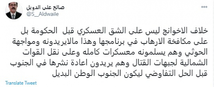 وكتب في تغريدة عبر "تويتر" رصدها "المشهد العربي": "خلاف الإخوانج ليس على الشق العسكري قبل الحكومة بل على مكافحة الإرهاب في برنامجها وهذا ما لايريدونه ومواجهة الحوثي وهم يسلمونه معسكرات كاملة وعلى نقل القوات الشمالية لجبهات القتال وهم يريدون إعادة نشرها في الجنوب قبل الحل التفاوضي ليكون الجنوب الوطن البديل".