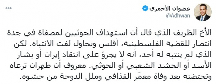 وقال في تغريدة عبر "تويتر" رصدها "المشهد العربي": "الأخ الظريف الذي قال أن استهداف الحوثيين لمصفاة في جدة انتصار للقضية الفلسطينية، أفلس ويحاول لفت الانتباه".